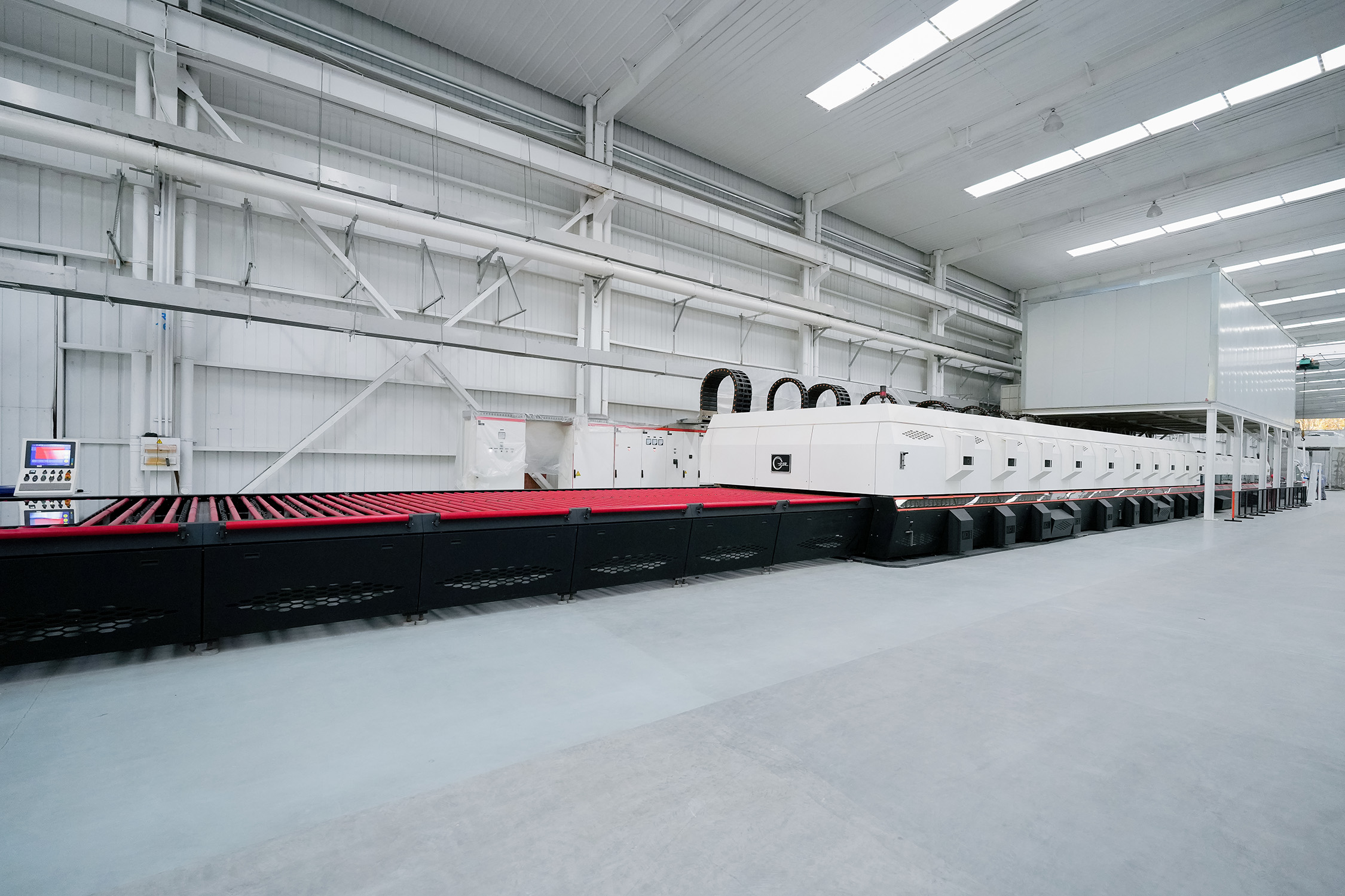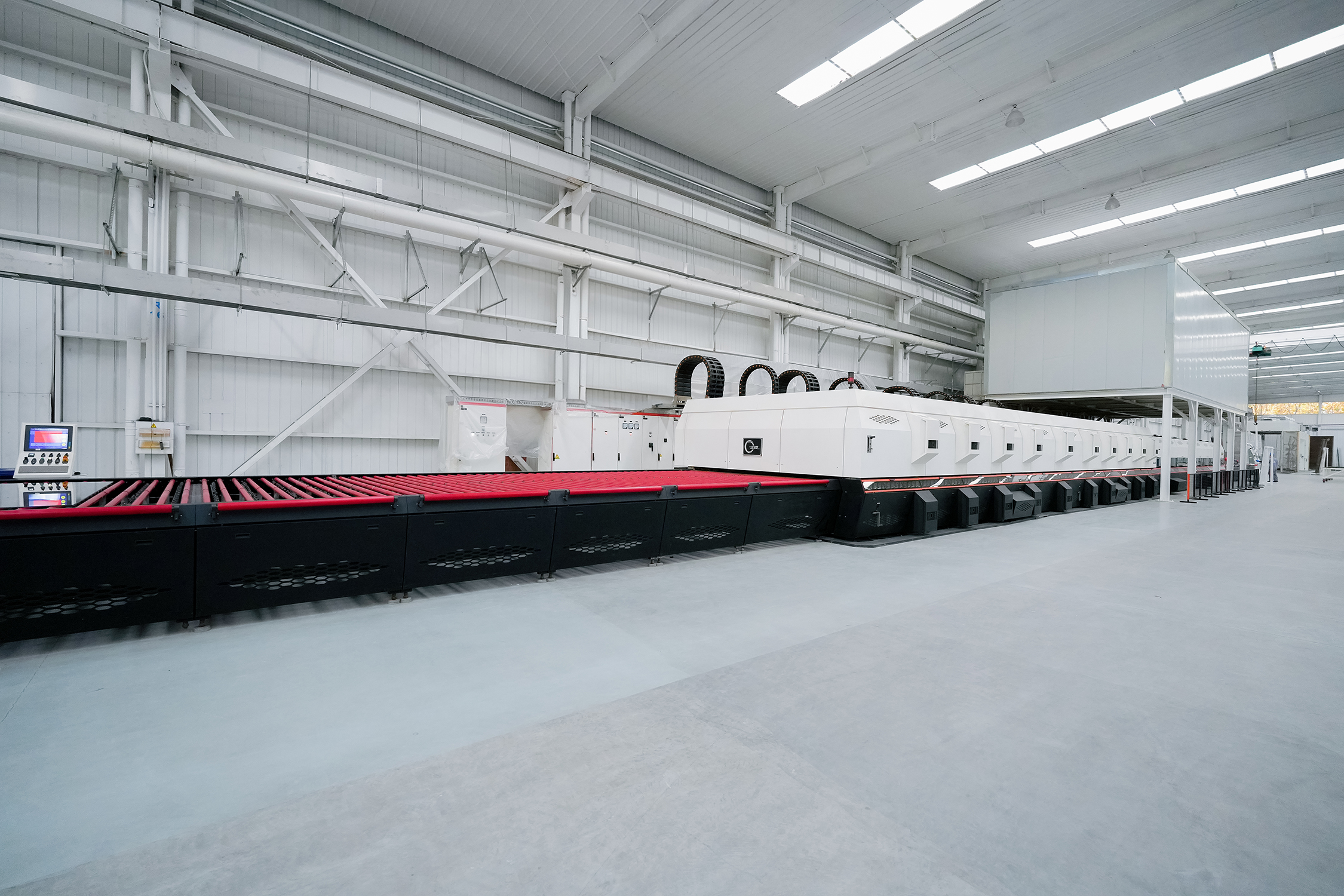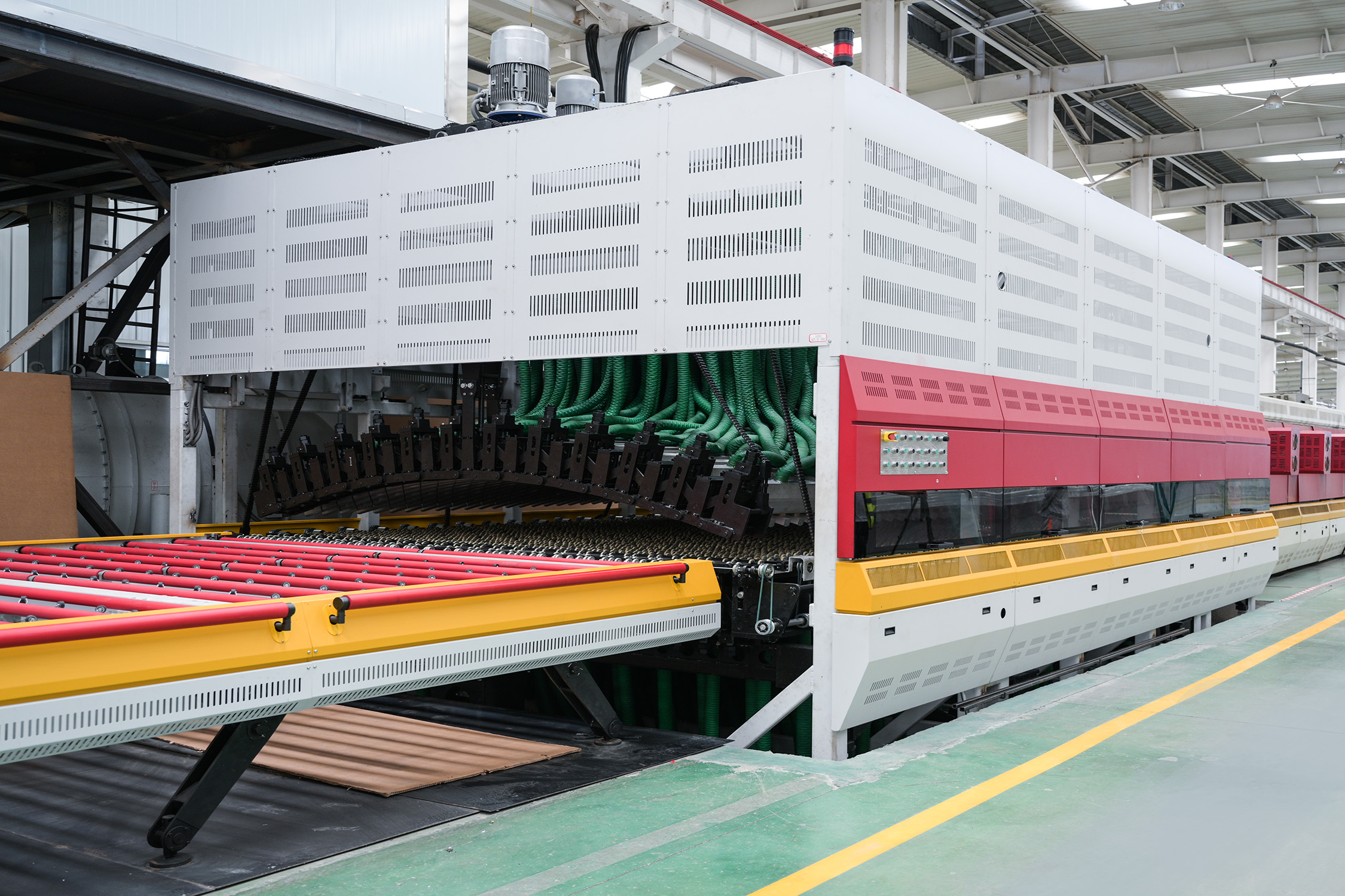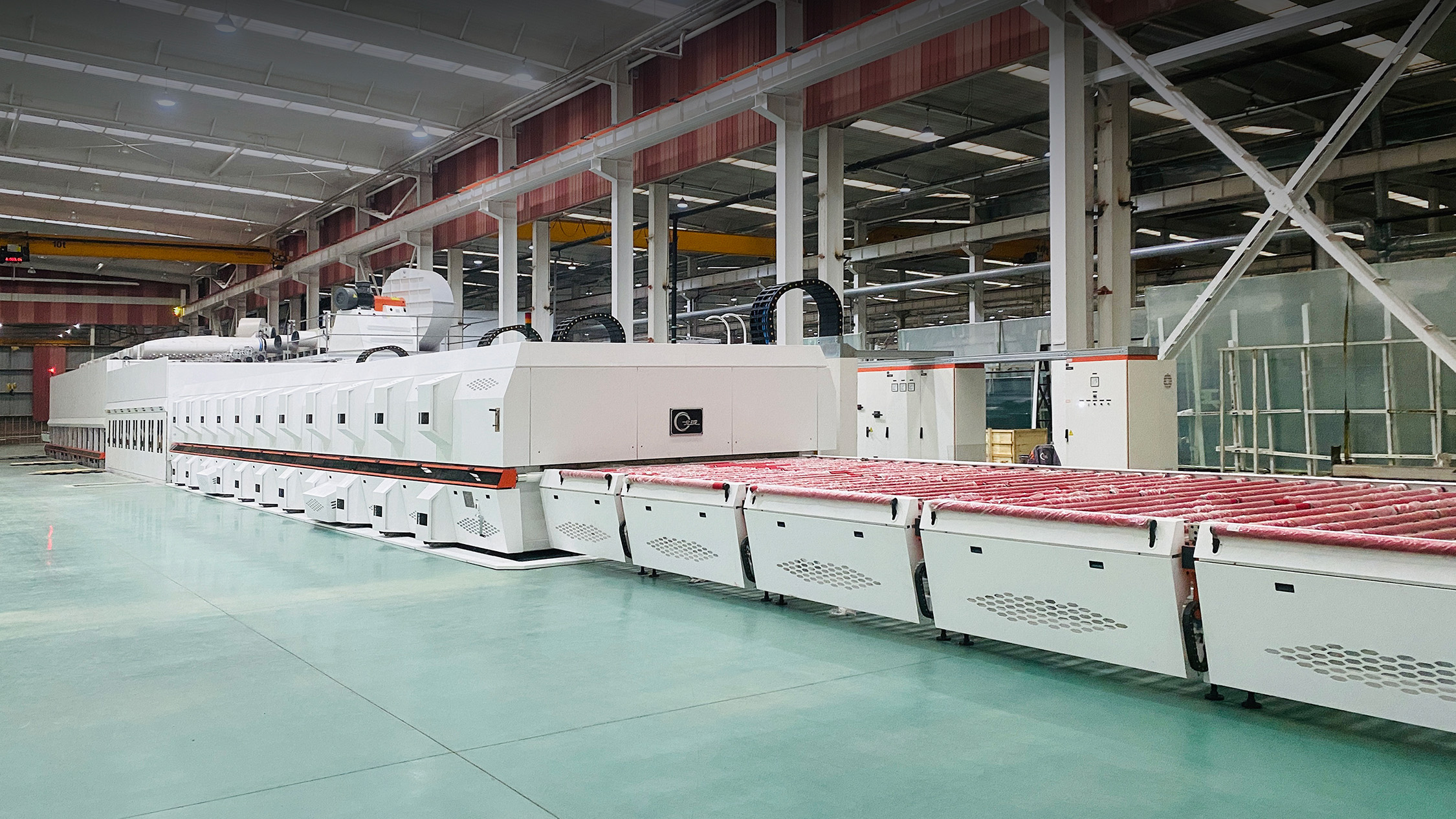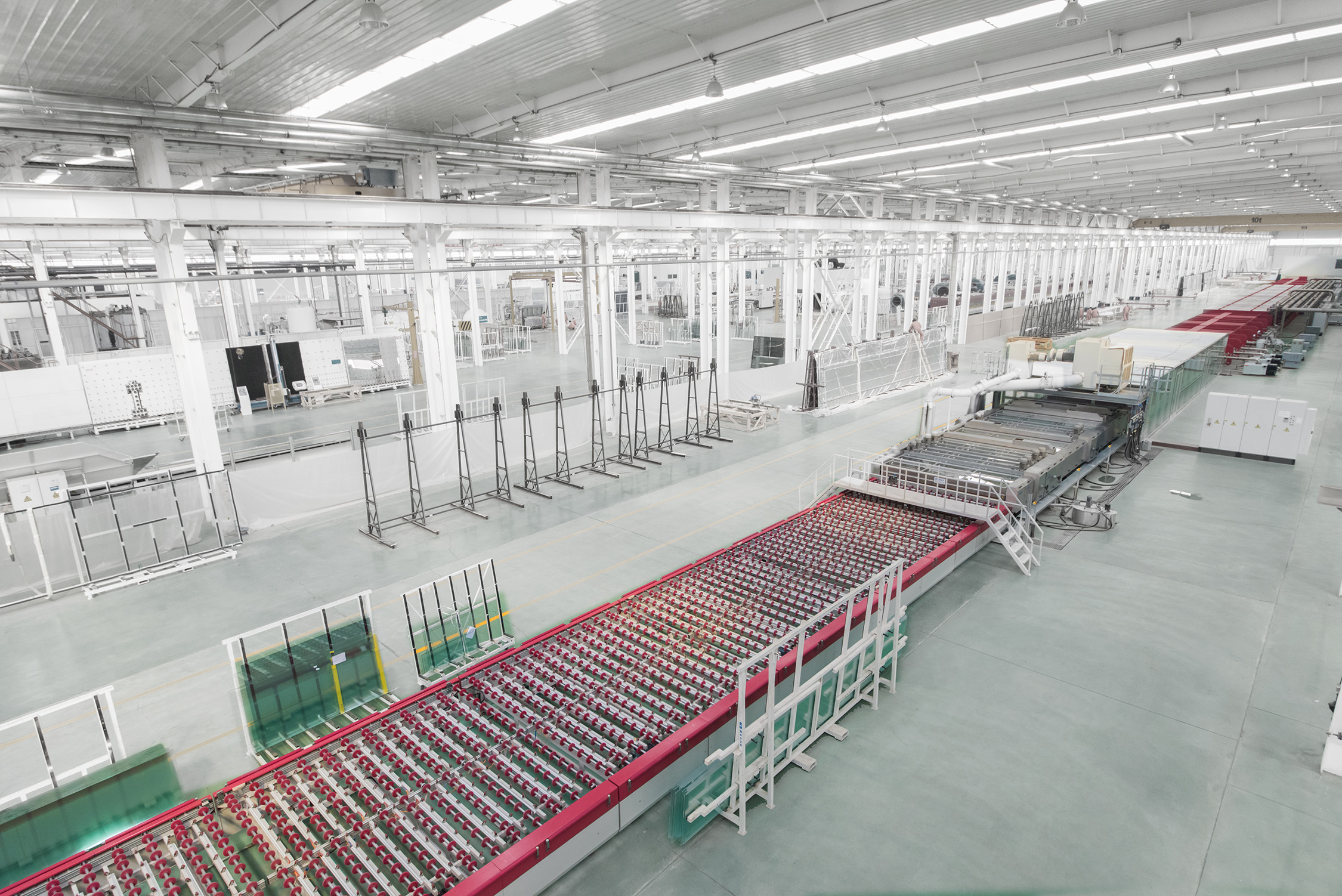北玻多次突破钢化玻璃加工尺寸极限,如8(弧长)×4米弯钢钢化炉,3.3(弧长)×24米平钢钢化炉,3.6×18米平弯钢化炉。北玻生产的连续炉在市场上占有领先地位,累计销量超300台,无论产能、能耗还是产品品质、设备稳定性都具有明显优势,是广受光伏产业和其它产业玻璃加工厂信赖的生产设备。